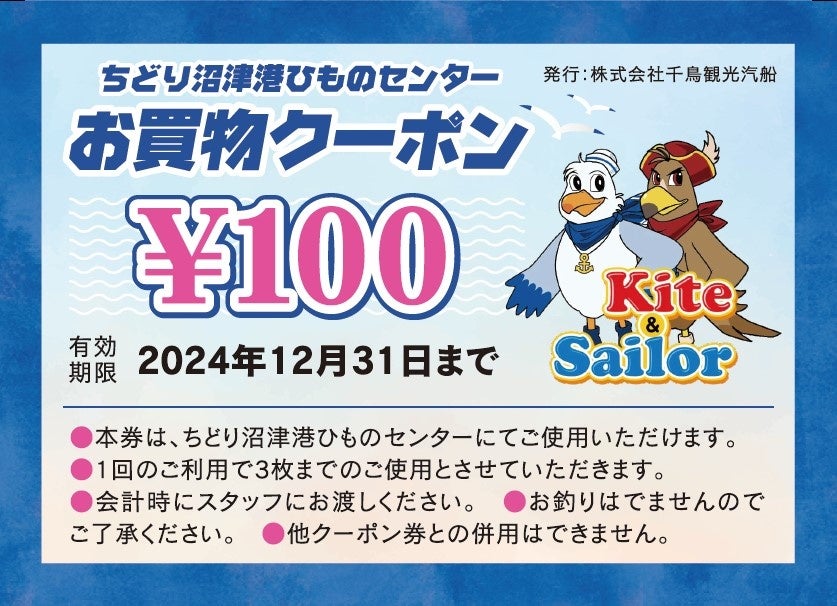 「沼津港ちどりひものセンター」にてご利用いただける300円分のクーポン券をプレゼントいたします。